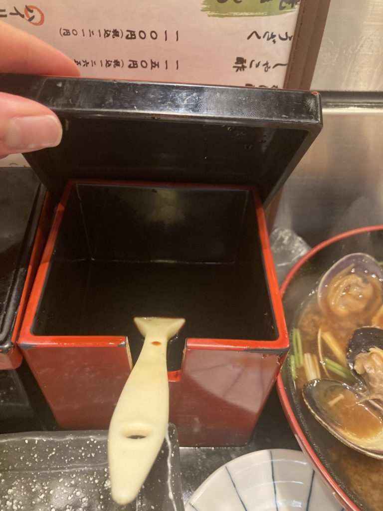 私も含め多くのお客さんが「醤油がない!」と悩んでいたようだったので念のため記載しておきます。黒い入れ物がガリで赤い入れ物が醤油です。